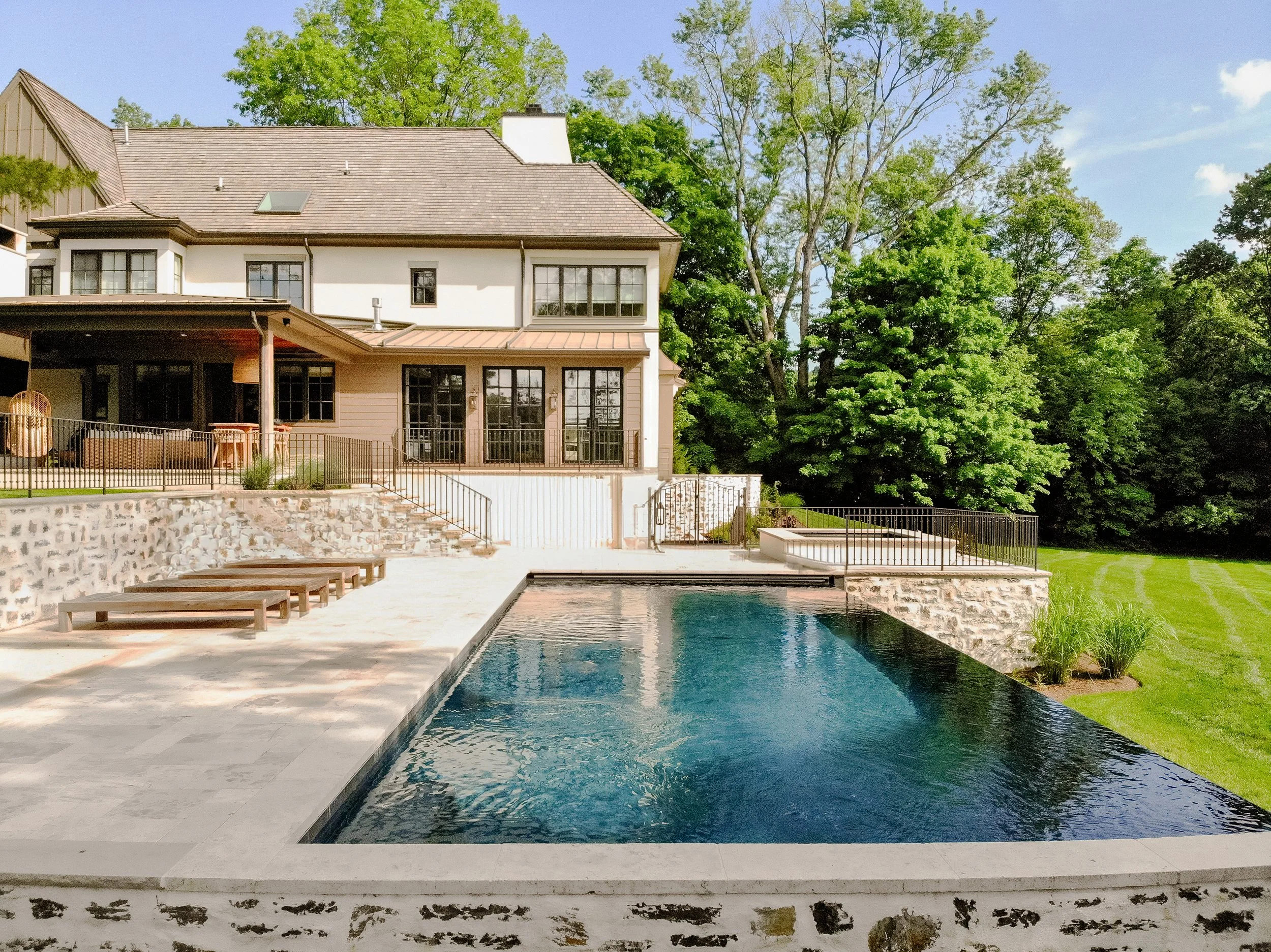 We worked with R.A. Hoffman architects, Cordaro Design and Yohn Engineering to develop this new construction home in the style of an Italian Villa. Includes five bedrooms, five full baths and one half bath, making the home very spacious. Armond Pools created an infinity pool and spa, surrounded by natural stone terraces and outdoor living spaces. Repurposed exposed interior and exterior wood beams were crafted by Provenance Timber. JM Resources worked to incorporate smart home automation.